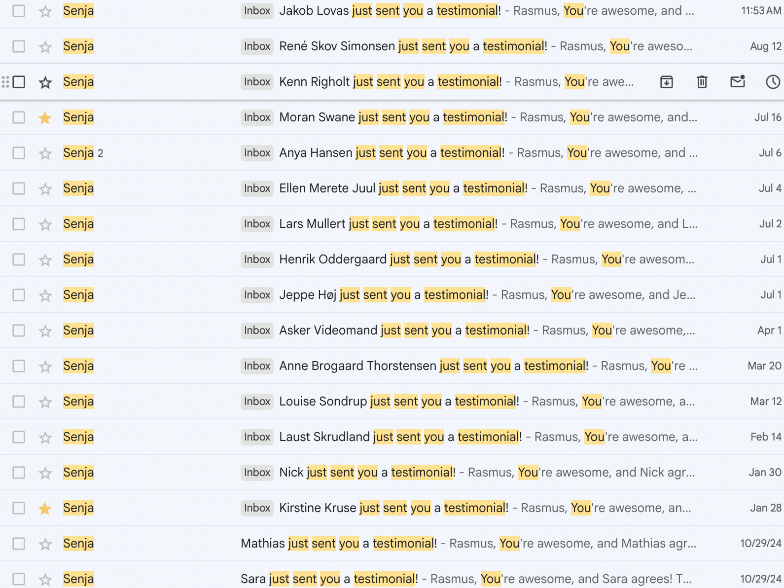 I alt har jeg indsamlet 37 testimonials siden jeg begyndte at bruge Senja for 2 år siden: