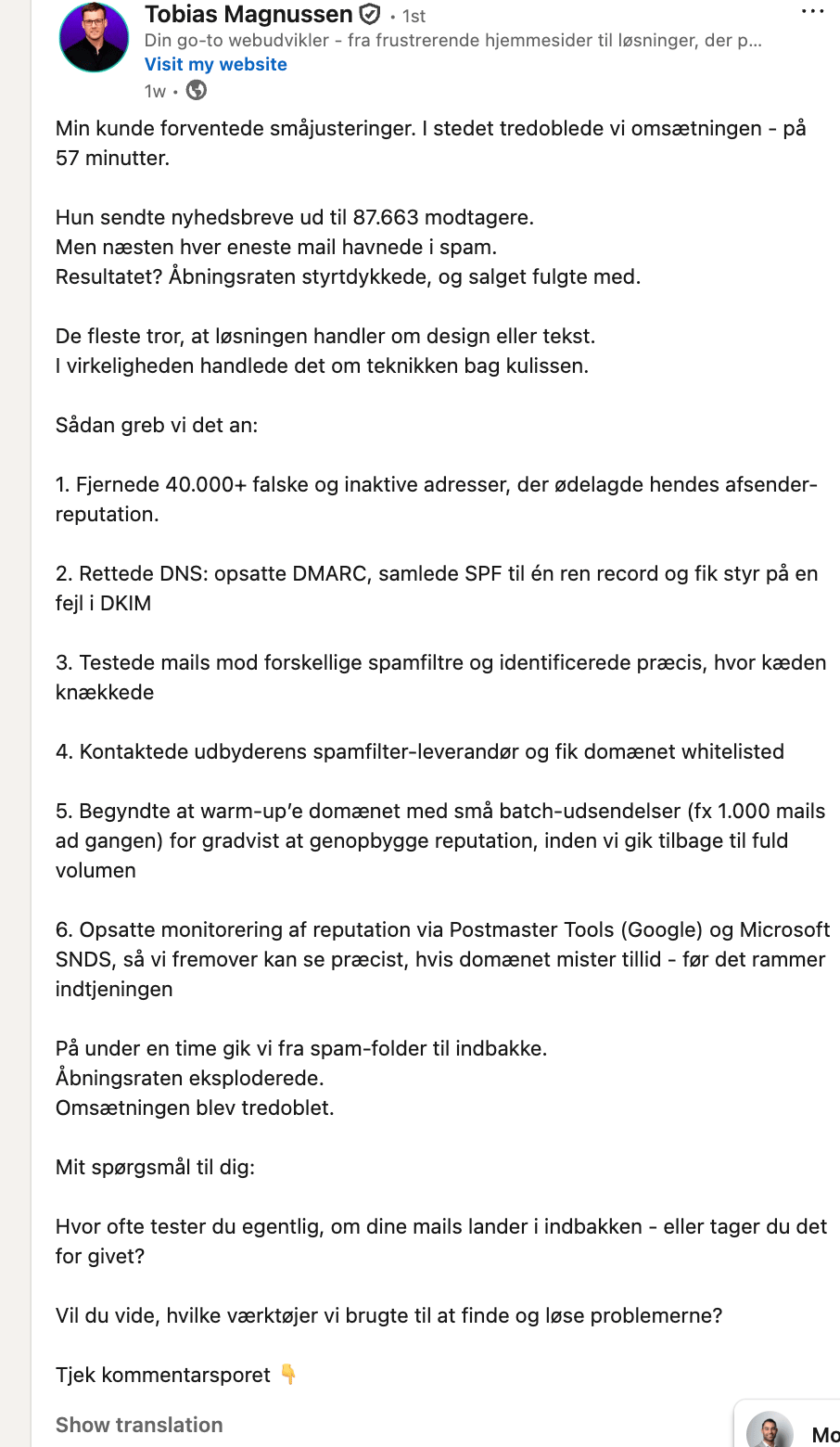 Webudvikleren Tobias fortalte mig at følgende opslag (som han skrev efter at have set min hook-masterclass) gav ham 3 kundehenvendelser.